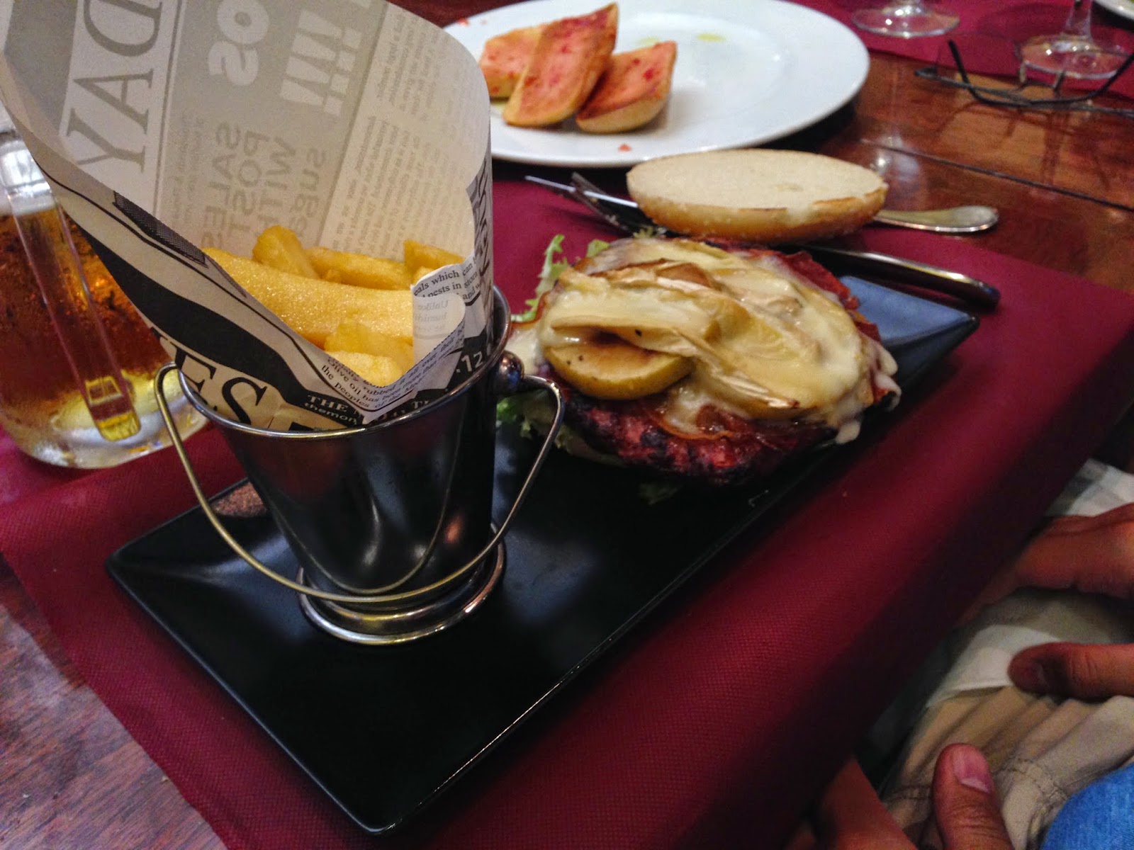 | Nick got an ox burger with bacon, apple and brie. He and Den originally thought that they were going to get apple wood bacon, but they actually got apple slices and bacon on the burger. It wasn't a bad combination, but the burger was pretty dry. |